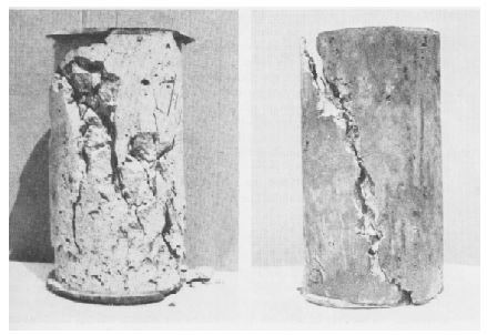 콘크리트 공시체의 압축력 시험 후 파괴된 형상 [출처]네이버 블로그 파괴된 기둥의 단면 형상을 보면 압력이 가해져 파괴된 것으로 보입니다.